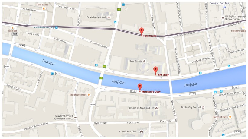 На северном берегу возле моста O'Донован Росса находится здание Четырех судов — один из основных памятников дублинского классицизма. И по сей день тут проводятся заседания, правда уже только по гражданским делам. Здание частично открыто для посещения: совершенно бесплатно можно полюбоваться несколькими залами.