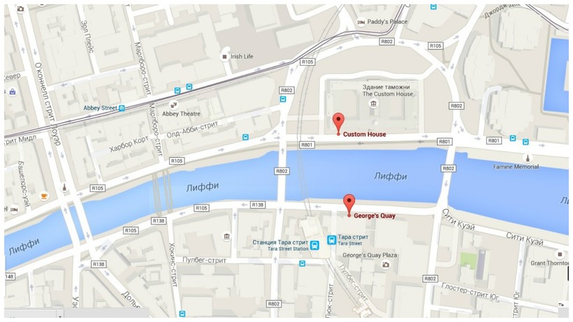 Адрес: Custom House Quay, Dublin. Добраться сюда можно любым транспортом идущим до моста О’Коннелла, а от него пешком 11 минут вдоль реки. Поблизости также есть удобная автобусная остановка Jury's Inn Custom House Quay, № 151, 500,501 и так далее.