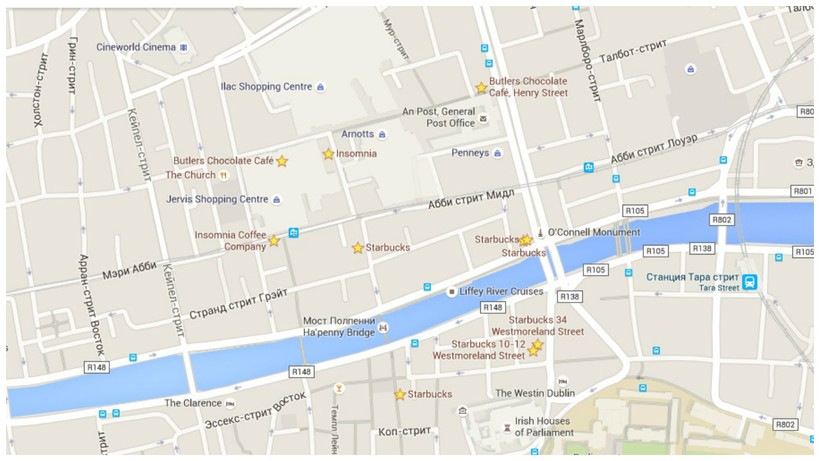 Напоследок я порекомендую вам некоторые трапезные заведения, ведь после долгой прогулки вы, скорее всего, проголодаетесь. Если вы не ищите чего-то экзотического, а хотите просто выпить чашечку кофе/чая, то можно забежать в ближайший Starbucks, Insomnia или Butlers Chocolate. Здесь можно перекусить от €5 (напиток + выпечка).