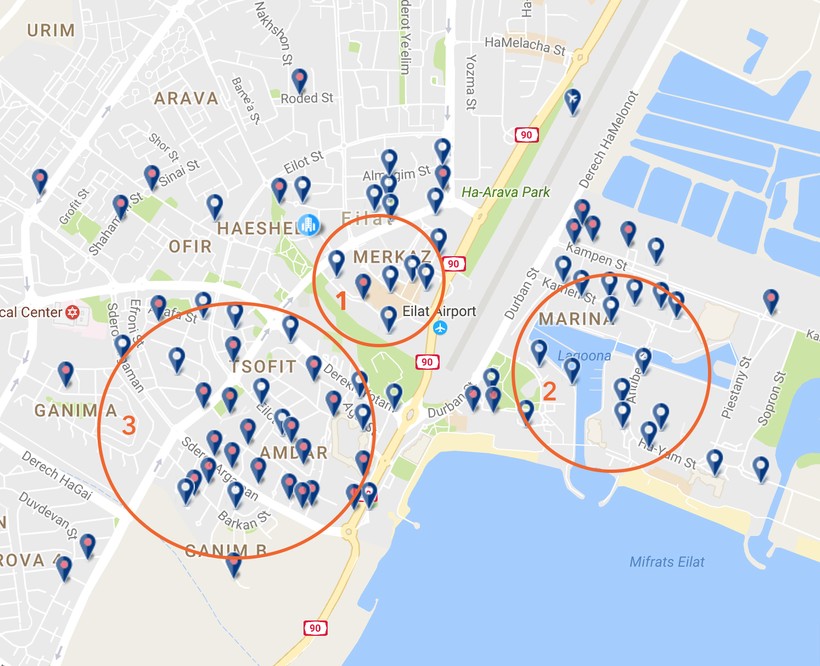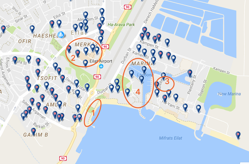 Главная и очень странная особенность урбанистического планирования в Эйлате – это аэропорт в центре города. Собственно, центр (на иврите «Merkaz») – это район вокруг аэропорта и Центральной автобусной станции ( №1 на карте).