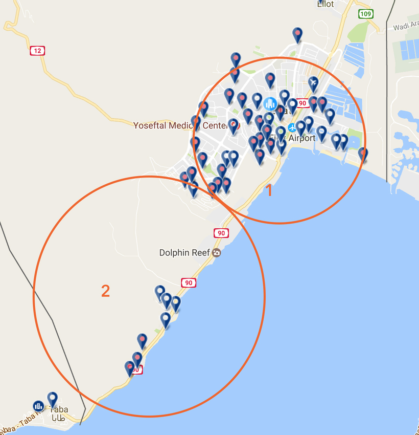 Сейчас оптимальными по соотношению цена/качество я считаю районы Tzofit и Amdar (№3 на карте). Цена за ночь в недорогих колеблется от 50 до 100 EUR за ночь, у многих есть свои бассейны. Опять же, здесь работает правило — чем дальше от аэропорта, тем лучше.