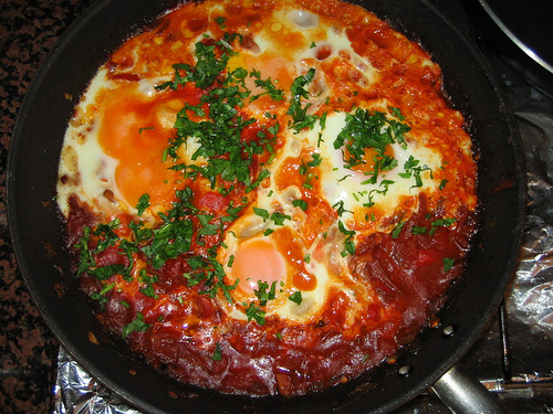 Еще одно удивительное израильское блюдо, которое имеет арабские корни. Шакшука – дешевая и сытная еда. Это смесь из помидоров, лука, большого количества чеснока, а также некоторых необходимых для этого блюда специй, таких как сладкая паприка. Ингредиенты просто бросают в блюдо. Затем в эту же сковороду кидают яйца и готовят яйца-пашот.