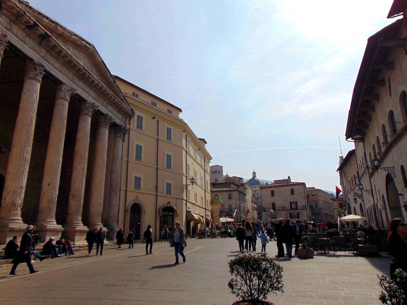 Следуя Виа Сан Руфино (спускаясь вниз от собора) вы придете к площади del Comune в центре города. Здесь есть маленький фонтан, который известен как «фонтан львов». На этой площади две основных достопримечательности: дворец del Capitano del Popolo с башней с часами и красивая церковь Святой Марии с впечатляющими римскими колоннами. Ассизи, старый римский город, имеет свой храм, посвященный Минерве, богине мудрости. С переходом к христианству храм был преобразован в Католическую церковь. Этот храм был полностью перестроен в начале 90-х годов XX века, и его внутреннее убранство резко контрастирует с фасадом. На площади del Comune также можно найти туристический информационный центр.