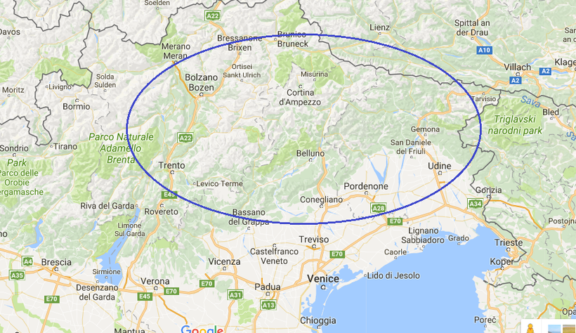 В самом начале статьи я говорила, что согласно административно-территориальному делению Италии, Доломитовые Альпы не являются отдельным регионом. Они находятся на территории Трентино-Альто-Адидже, Венето и Фриули-Венеция-Джулия, которые, в свою очередь, граничат с Ломбардией и Эмилией-Романья.