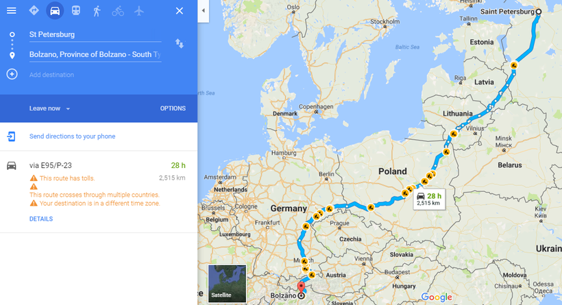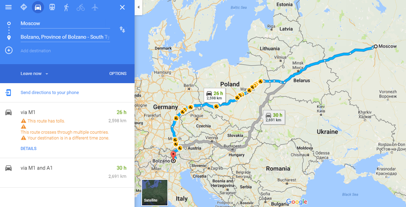 Если взять за конечную точку город Больцано — хоть и не самое сердце горного хребта, но достаточно крупный населенный пункт, то можно увидеть, что маршрут из столицы нашей необъятной родины насчитывает почти 2600 км, а по времени это займет больше суток.