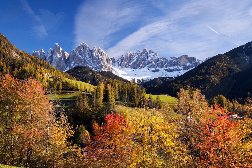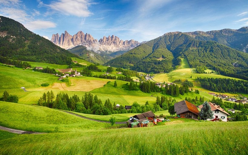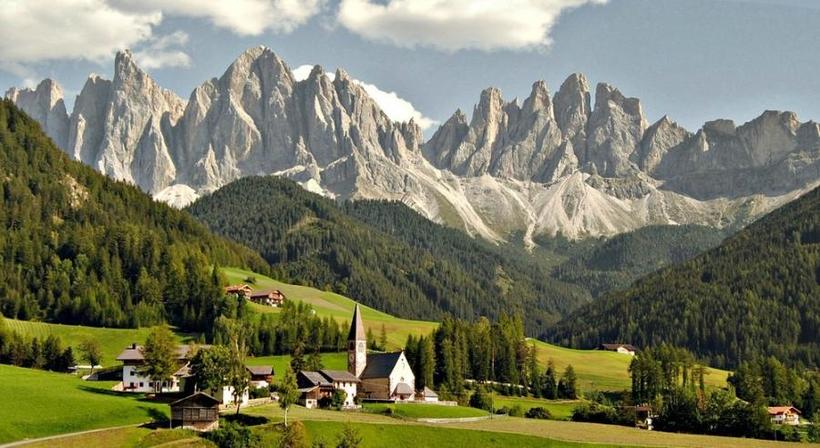 - Деревня Санта-Маддалена и знаменитый пейзаж, запечатленный на тысячах фотографий — маленькая церквушка на фоне могущественных горных массивов.