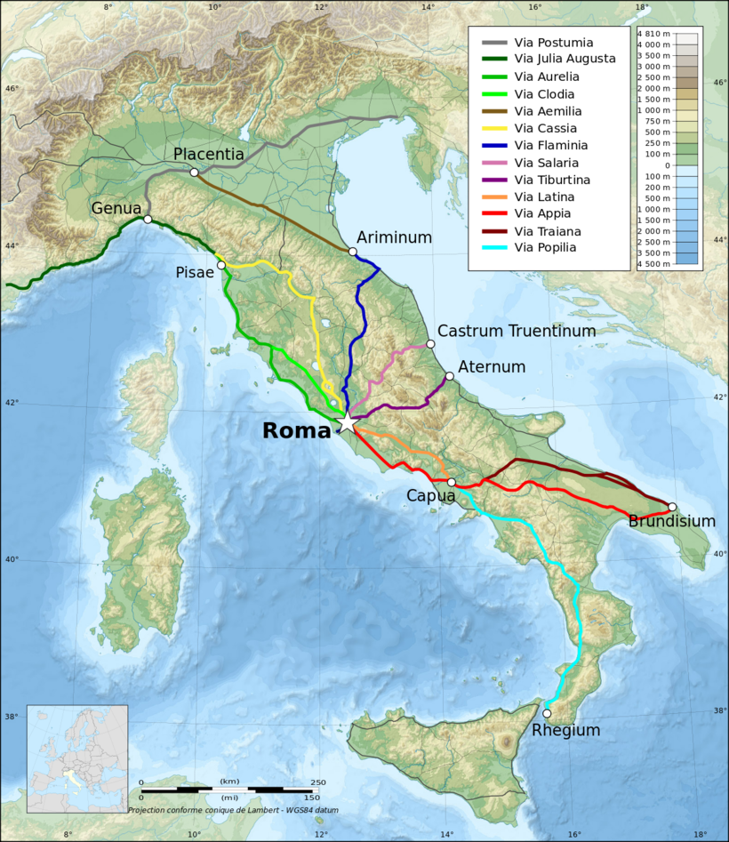 Эти крупные города (от Римини до Пьячецы) связывает дорога, которая была построена еще в 187 году до Рождества Христова и носит название La Via Emilia или же Эмилиева Дорога (указана на карте коричневым цветом). На самом деле, большая часть городов (как и сам консульский путь), которые расположены вдоль этой дороги были основаны римлянами. Более того, Эмилиева Дорога связывала между собой два других важных римских пути. Первый вел из Римини в Рим (темно-синий цвет), а второй — из Генуи в Пьяченцу (темно-серый цвет). Сегодня Элимиева Дорога римлян превратилась в национальную трассу №9, а свое современное название регион получил именно в ее честь.