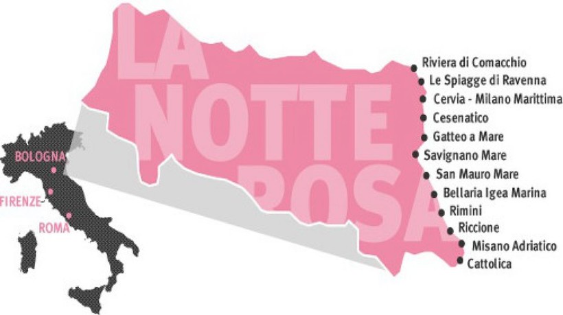 «Розовая ночь» охватывает практически все города, таким образом, все побережье Ривьеры отмечает этот фестиваль. Более того, он отмечается не только в Романской части региона Эмилия-Романья, но спускается вплоть до Пезаро, а этот город уже принадлежит региону Марке.
