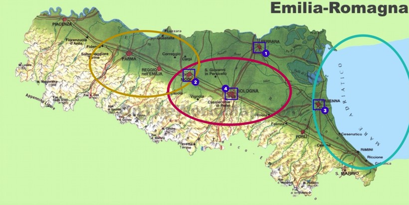 На карте выше синими прямоугольниками отмечены города, которые воплощают в себе основные достопримечательности региона. Именно они на протяжении веков являлись (и продолжают являться) центрами культурной и духовной жизни региона Эмилия-Романья.