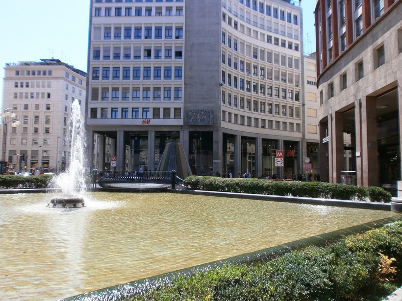 Пройдя всю улицу Витторио Эмануэле II, мы попадаем на площадь Сан-Бабила, ограничивающую её с западной стороны. Это очень современная и просторная площадь, большую её часть занимает огромный фонтан. Как мне удалось узнать, фонтан имеет определенные символические отсылки. Он символизирует ландшафт Ломбардии и напоминает о круговороте воды в природе.