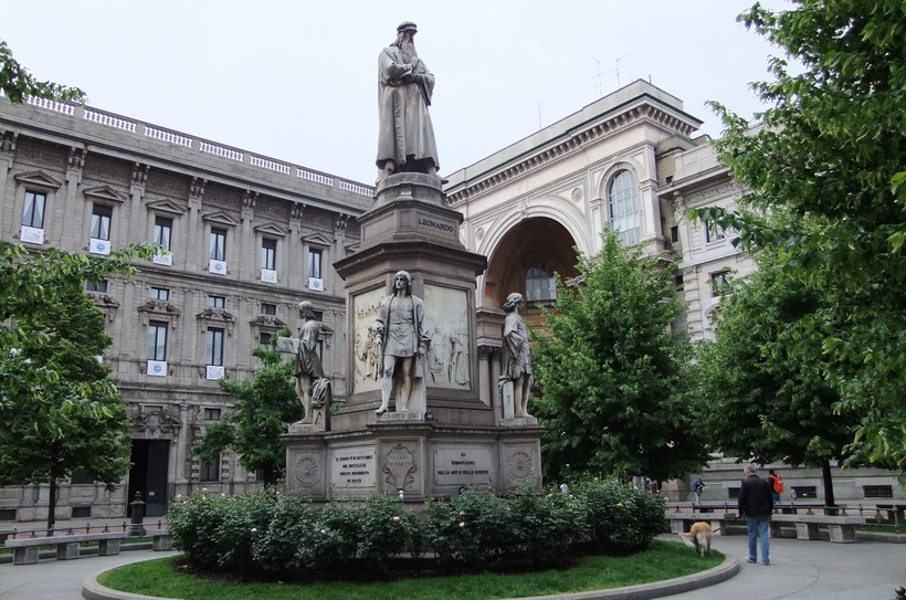 За происходящим на театральной площади наблюдает с каменного постамента Леонардо да Винчи.
