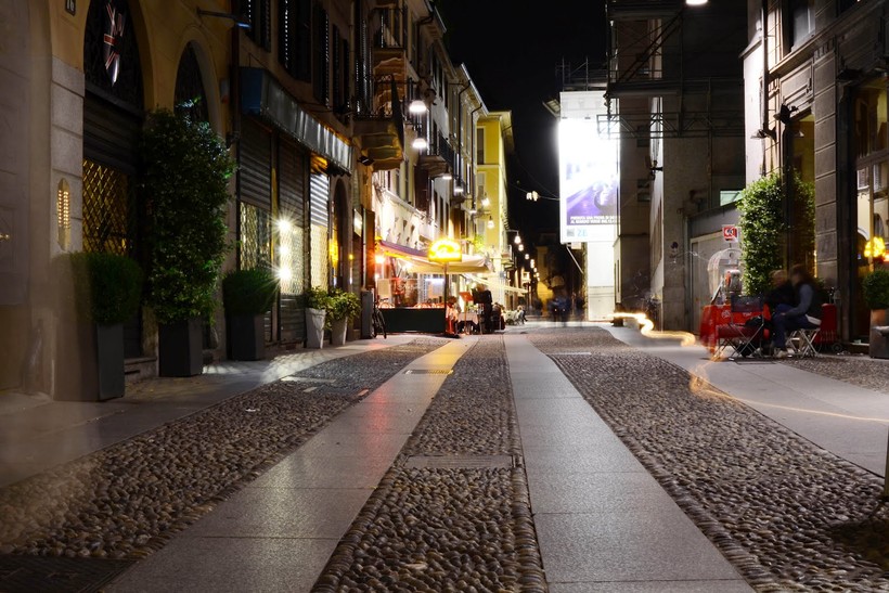 Сама улочка Корсо Комо на мой взгляд довольно уютная: невысокие дома с балкончиками и цветочными клумбами. Уличная ресторанная площадка идёт прямо по центру улицы.