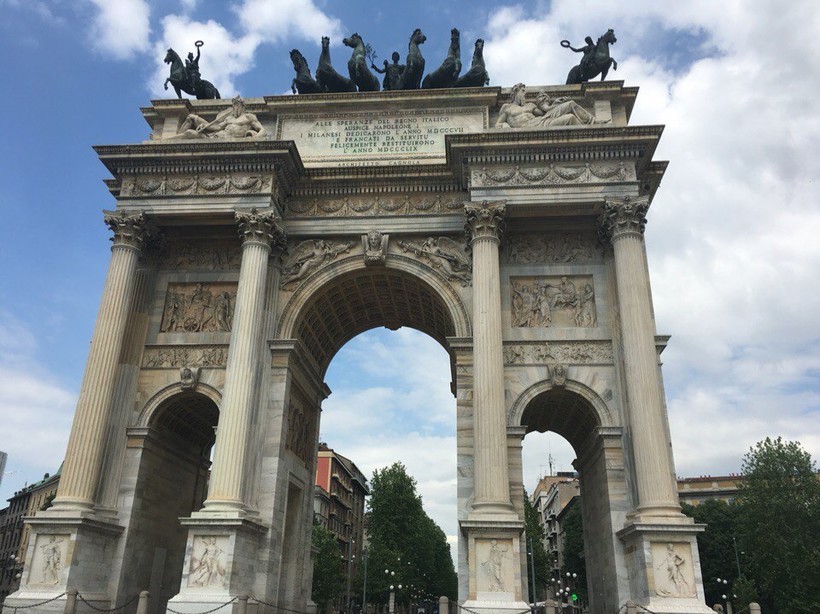 Прошедших парк насквозь ждёт сюрприз – великолепная Arco della Pace или Арка Мира. Как и все старинные памятники архитектуры Милана, арка торжественна и монументальна. Она украшена фигурами божеств, статуями всадников на лошадях и создаёт очарование Парижа в северной столице Италии.