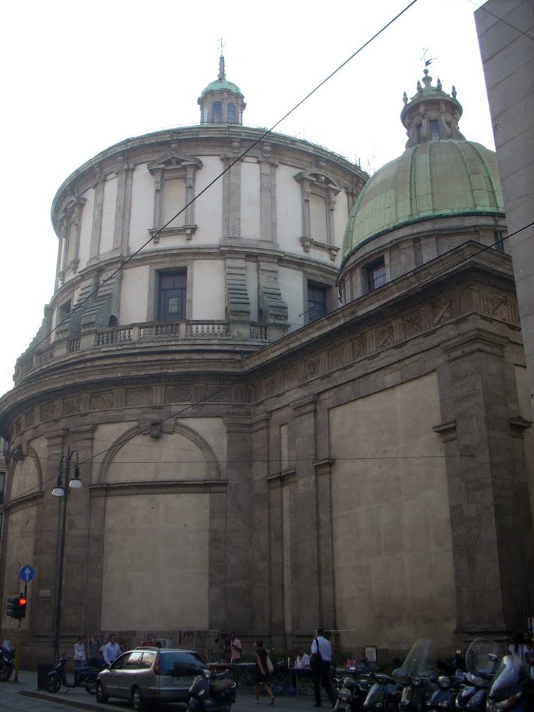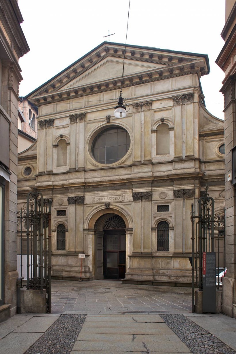 На улице Торино расположена церковь Chiesa di Santa Maria presso San Satiro – церковь Сан-Сатиро. Она небольшого размера, а её фасад спрятан в глубине за железными воротами, из-за чего мимо неё легко пробежать в суматохе улицы Торино. Но я дам вам ориентир: идя по улице от Дуомо, ищите слева от себя железные ворота.