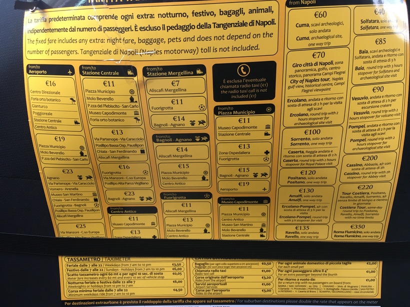 Перед тем, как сесть в автомобиль, убедитесь, что это настоящее такси. Машина должна быть белого цвета, на ней должен быть фонарик с «шашечками», на двери — номер телефона компании, а также значок «Commune di Napoli». В машине должен быть счетчик и табличка с ценами, ниже я прикладываю такую. По ней можно понять, что такси в Неаполе — удовольствие дорогое.
