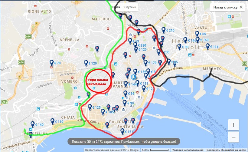 Большинство отелей располагается в центральной бухте города, недалеко от исторического центра. Глядя на карту, можно подумать, что все они рядом друг с другом, но в реальности гора замка Сант-Эльмо довольно сильно затрудняет передвижение между некоторыми районами. На карте, расположенной ниже, я постаралась выделить цветами районы отелей, в которых стоит селиться (красные) и в которых лучше не останавливаться (черные) по причине неблагоприятной обстановки в округе. Все остальное, выделенное зеленым, расположено либо слишком далеко, либо на склоне горы и добираться туда пешком неудобно.