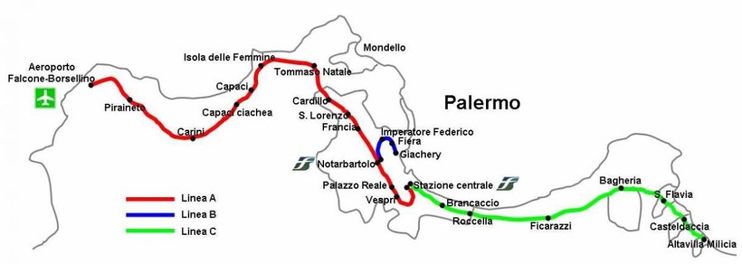 - Trinacria Express — относительно скоростной поезд (45 минут и вы на Центральном Вокзале). Все остановки и пересадки хорошо видны на фото ниже.