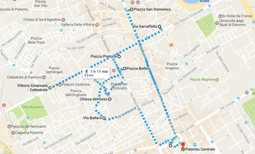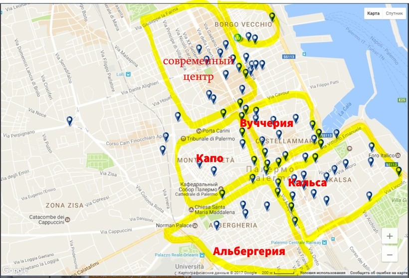 Все эти кварталы очень разные, но их связующим звеном (то есть центром) является Quatro Canti. На карте ниже для наглядности отмечены примерные границы.