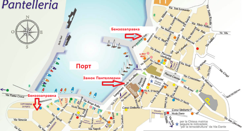 В порту города Пантеллерии расположены две единственные заправки на острове. Стоимость бензина — 1,9 EUR/литр.