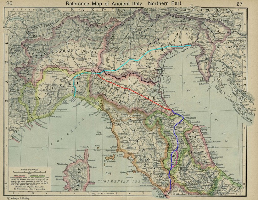 На карте дорога от Рима до Римини показана синим цветом, а от Римини до Плацентии — красным.