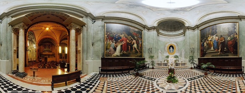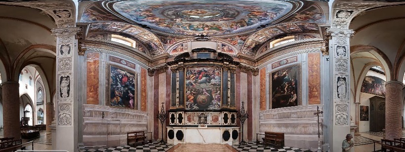Раньше в алтаре располагалась изумительная работа Рафаэля Санти «Сикстинская Мадонна», которая была написана в 1512-1513 годах для этого здания. В XVII веке для полотна изготовили специальную барочную раму с пышным оформлением. Сейчас на месте оригинала находится созданная Пьером Антонио Авандзини копия, которая заменяет «Мадонну» с середины XVIII века. Картина Рафаэля была продана Августу Саксонскому.
