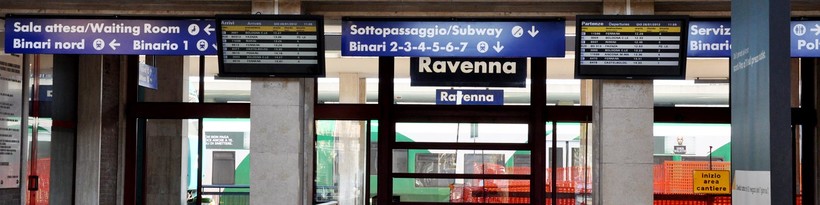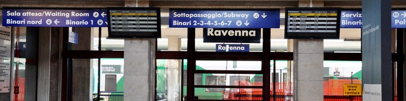 В целом, между крупными и не очень городами железнодорожный транспорт развит хорошо. Вокзал находится в 7–10 минутах ходьбы пешком от центра города, куда и прибывают все поезда (в том числе поезд из Болоньи). От аэропорта Болоньи можно доехать на поезде с пересадкой в центре Болоньи. Поезда Болонья — Равенна ходят часто, примерно каждый час, билет обойдется в 7,35 EUR и время в пути составляет 1 час 20 минут. Это поезд а-ля «электричка», и цена на него всегда одна и та же, поэтому не нужно покупать билет заранее. Но если вы едете из Милана, Рима или другого города, который находится достаточно далеко от Равенны, советую купить билет онлайн заранее на сайте Tren Italia, он обойдется дешевле. Например, цена билета из Милана начинается от 20 EUR, из Рима — от 32, из Неаполя — от 43.