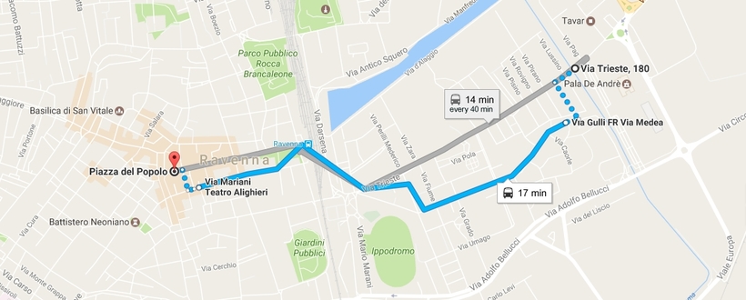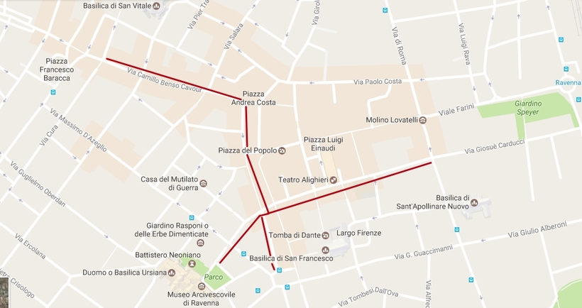 Железнодорожный вокзал находится очень близко к центру, буквально в 7–10 минутах пешком. В качестве ориентира на карте ниже я выделила путь от станции до одной из центральных площадей Равенны — Piazza del Popolo.