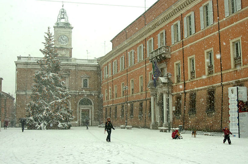 Несмотря на близость Адриатического моря, не пугайтесь и смело езжайте в Равенну и зимой, если представилась такая возможность. Температура редко опускается ниже нуля, но к вечеру становится достаточно холодно. Бывают, конечно, пасмурные и дождливые дни, но бывают и теплые, солнечные. Снег бывает нечасто да и лежит недолго (фото ниже – редкое исключение). Если едете в декабре, могу вас заверить, город будет красиво украшен, но достаточно сдержанно. В Италии не украшают так массово, как в Германии или Швейцарии. Мне лично Равенна особенно нравится перед Рождеством. На площади Piazza del Popolo устанавливают елку, открывается Рождественский рынок, на котором продают елочные игрушки, десерты и горячий глинтвейн. Также там проводятся концерты и выступления местных спортивных, танцевальных и хоровых коллективов.