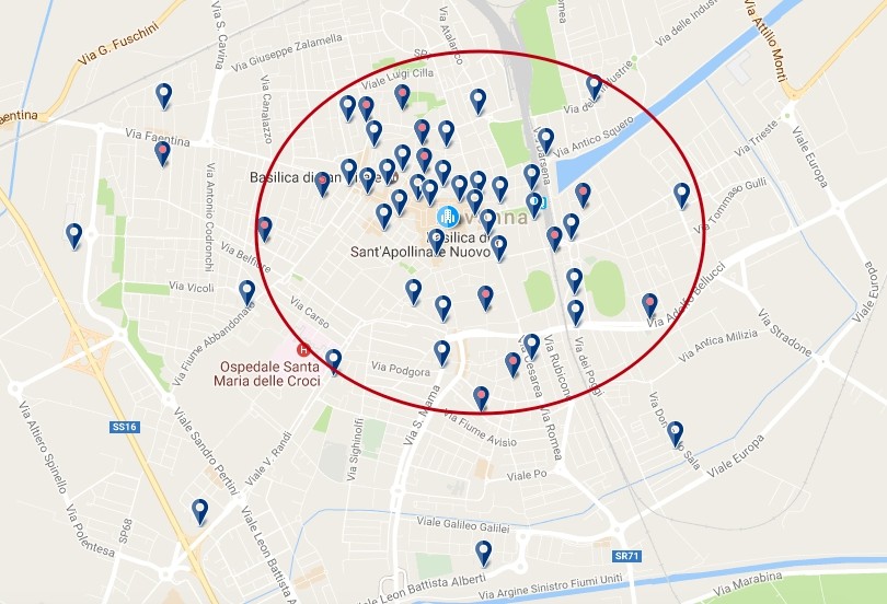 Вне обозначенной на карте зоны вы можете найти квартиры(отели, как вы видите, все же находятся в самом центре). Для поиска можете воспользоваться сайтом. И если вдруг вы найдете квартиру, которая вам очень понравится, но расположена она немного в отдалении, не переживайте, смело бронируйте, так как Равенна все равно маленький город, и добраться будет легко :)