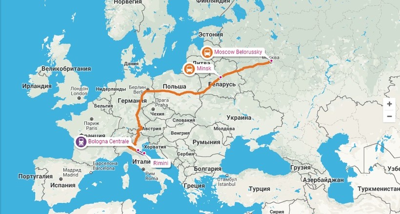 Поисковик при запросе «поезд Москва — Ницца» выдаёт сомнительные ссылки на торговые центры и рестораны города, но вы ему не верьте, наверняка завидует. Каждый четверг с Белорусского вокзала отправляется поезд 017Б Москва — Ницца с живописным маршрутом через Смоленск, Белоруссию, Польшу, Чехию и Австрию. О его конечном пункте вы уже догадались, а чтобы попасть в Римини, следует выйти на станции «Верона Порта Нуова».