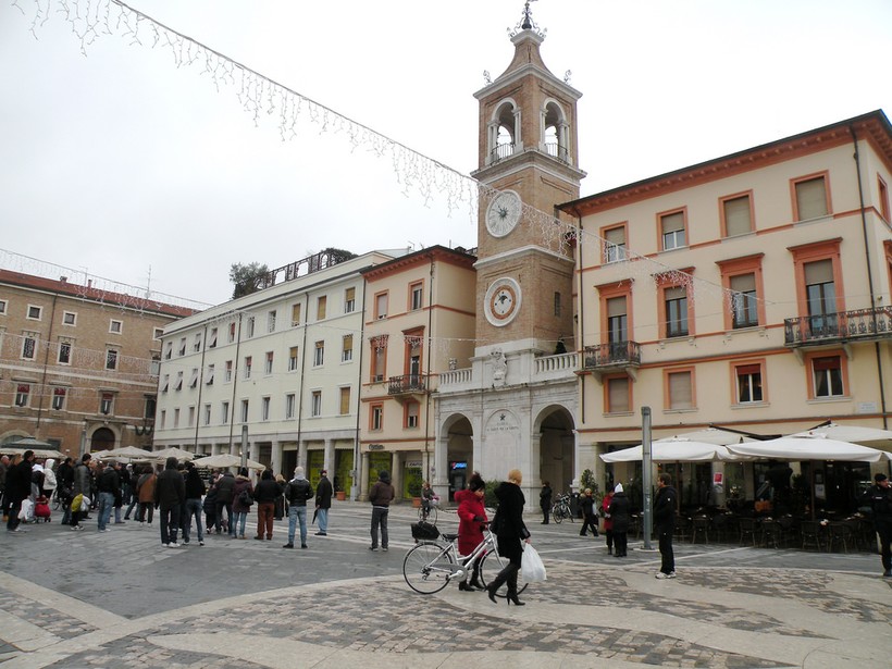 - Площадь Кавур (Piazza Cavour) является центром города и привлекает сюда не только туристов, но и местных жителей. Посреди площади возвышается статуя Павла V и фонтан Пинья, или Шишка. По периметру расположились важные городские постройки: дворец Аренго, служивший для средневекового собрания, дворец Коммунале (или общин), дворец Подеста (или дворец старосты). На месте некогда стоявшей на площади церкви Сан Сильвестро в середине XIX века был построен театр Аминторе Галли. Землетрясение 1916 года сильно повредило здания на площади, и позже они подверглись серьёзной реставрации. Здесь и на соседней площади Малатеста каждую среду и субботу устраивается городской рынок. Кстати, один из самых крупных и известных в регионе Эмилия-Романья. Известен он ещё с давних времён, поэтому вам стоит сюда зайти и побродить среди местных.