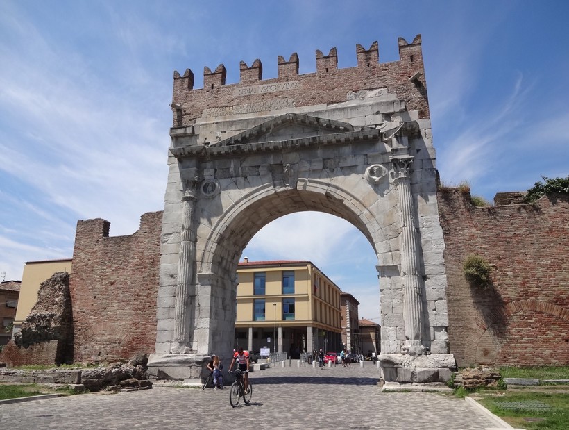 - Арка Августа (Corso d'Augusto). Эта древняя арка, постройка которой датируется XXVII в. до н.э., была возведена в честь Цезаря Октавиана Августа. Она является одной из старейших сохранившихся древнеримских арок. Построена она из камня, добытого в Истрии, и богато декорирована: с обеих сторон можно разглядеть изображения таких божеств, как Юпитер — отец всех богов, Нептун, Аполлон и Минерва. Широкий пролёт символизирует долгожданный мир, наступивший после периода гражданских войн, а декор имеет некоторый политический смысл. Об этом вы сможете судить, лишь взглянув на надпись, которая гласит о посвящении сей постройки в честь могущественного Цезаря Октавиана, сына Юлия Цезаря и великого реставратора римских дорог. Кстати, вершину арки когда-то венчала четвёрка коней под управлением самодержца, но позже её заменили зубчатым навершием. По обеим сторонам пролёта можно заметить головы быков, указывающих на могущество и значимость колонии Римини. Это и неудивительно, ведь арка находится на месте, где встречаются две важнейшие римские дороги: Фламиниева, ведущая в Рим, и Эмилиева, ведущая в Пьяченцу.