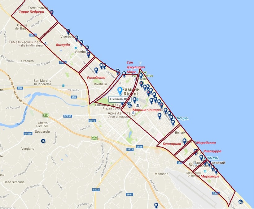 - 2 в районе Мирамаре: от пляжа 150 до Talassoterapico (Римини спа) и недалеко от границы с Риччоне.