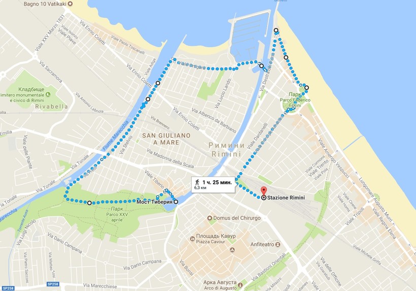 - Вдоль реки Мареккья можно дойти до парка 25 Апреля, прогуляться в тени деревьев и выйти к знаменитому мосту Тиберия.