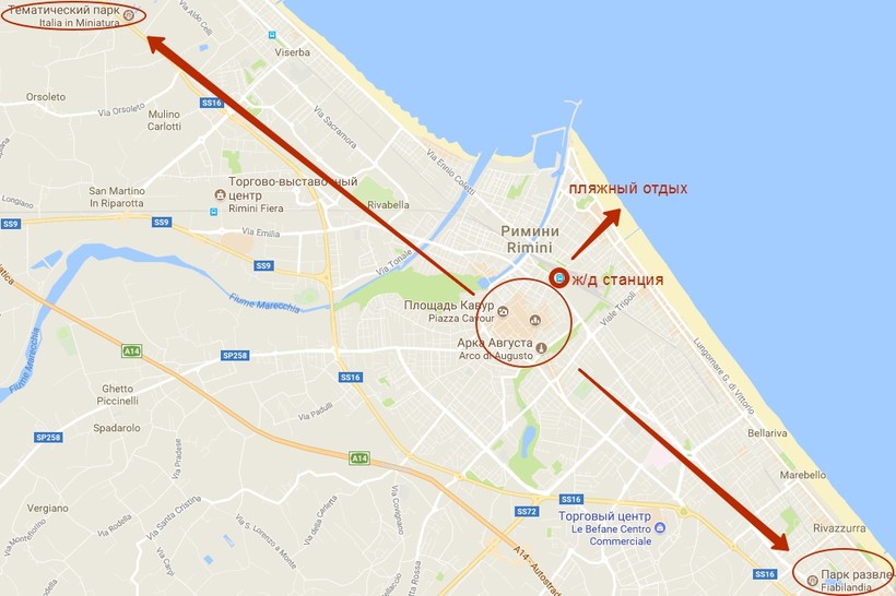 - Riminifiera, выход из которой приведёт вас прямиком к одноимённому выставочному центру и нескольким торговым центрам.