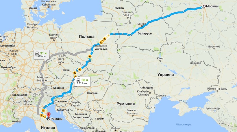 Расстояние от Москвы и Санкт-Петербурга до Римини по трассе составляет 2800 км, на дорогу без остановок вы потратите 30 часов. Лучше заранее подумать об остановках и забронировать отели на пути следования. Также не помешает рассчитать примерную стоимость бензина. В этом вам поможет специальный сайт, который показывает актуальные цены на бензин в Европе. У меня получилось около 300 EUR в одну строну при максимальном расходе топлива 10 литров на километр. Не стоит забывать, что для такой поездки нужны международные права и страховка. При следовании через Австрию нужно будет оплачивать платные дороги. В Италии они тоже есть, но обойдутся гораздо дешевле.