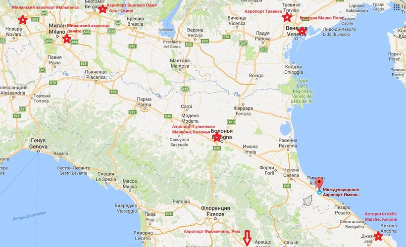 Если искать билеты до Анконы, то можно заметить, что цена на них стабильна и колеблется вокруг отметки в 190 EUR даже зимой. Здесь придётся совершить как минимум одну пересадку — например, в Риме. Как вариант, от Рима до Римини можно затем доехать на поезде (5 часов в пути и 20 EUR за билет). От Анконы до Римини поезд добирается за 1 час 20 минут, а билет стоит 7.30 EUR — этот вариант мне очень нравится.