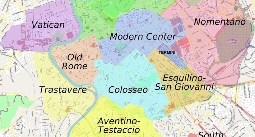 - Район вокзала Термини (как и центр, помечен бледно-синим)