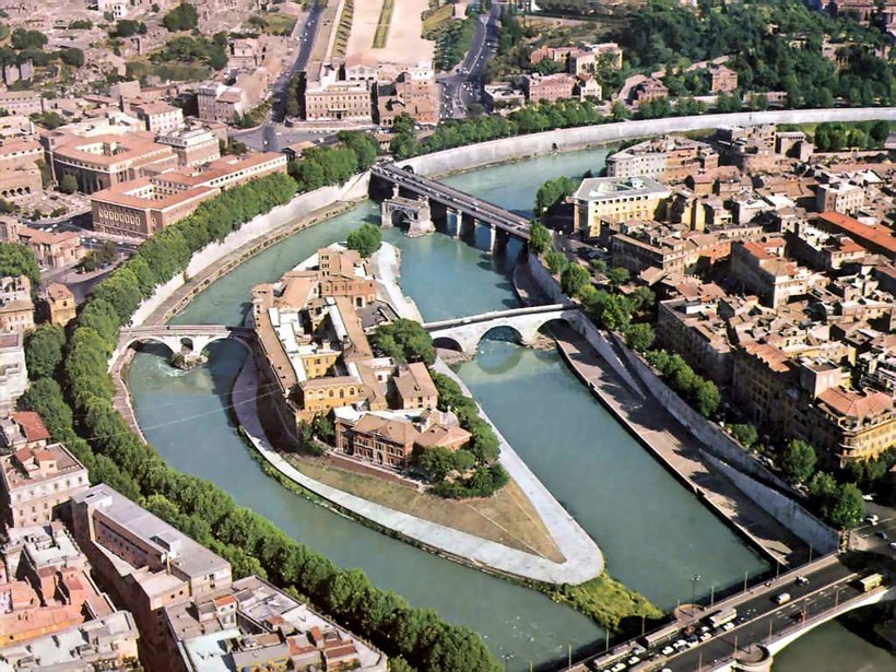 Isola Tiberina, Тиберина – это небольшой остров, расположенный прямо посреди реки Тибр, к югу от Ватикана. Попасть на него можно по двум древнейшим мостам города – Фабричо и Честио (первый век до н.э.!). Это маленькое, но очень насыщенное пространство, с которым связано сразу несколько легенд. Говорят, что труп сброшенного в реку короля Тиберия Гордого так оброс всякой "тритатой", что превратился в остров. Или, к примеру, что в реке он утонул, а Юпитер сделал его покровителем её вод.