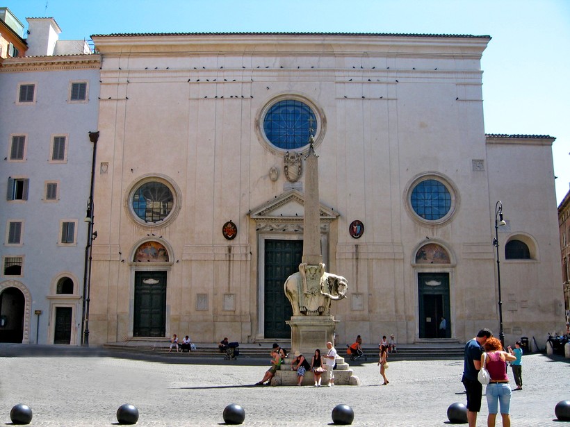 Я наткнулась на Базилику Санта-Мария-сопра-Минерва совершенно случайно: мое внимание привлек, как это ни удивительно, слон, рядом с которым группа немецких школьников внимательно слушала учителя.