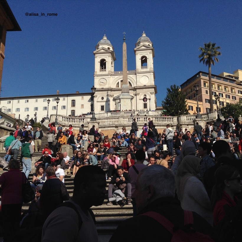 Площадь Испании и «испанская лестница» – это как Красная Площадь в Москве. Сюда направляются туристы в первую очередь (ну или хотя бы«во вторую», сразу после Колизея). Если продолжать сравнение, то Испанская площадь гораздо меньше Красной, а количество туристов на ней зашкаливает. Я учусь неподалеку, поэтому каждый день пробегаю в этом месте и обязательно на секундочку останавливаюсь полюбоваться на испанские ступени.
