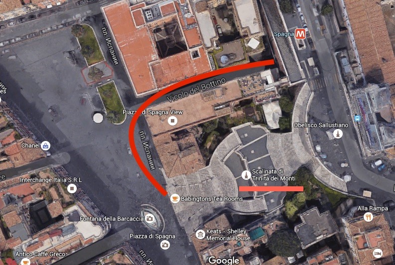 Из выхода метро пройдите 10 метров: вы выйдете на площадь Испании. Повернитесь, или даже посмотрите, налево: вы увидите и знаменитый фонтан Бернини – лодочку (по прозвищу «баркачча»), и – та-дам! – испанскую лестницу, уходящую наверх к церкви Trinita dei Monti. Из слова «наверх» вытекает и слово «вниз». Правильно, пешком к лестнице возможно прийти как «по низу», так и «по верху».