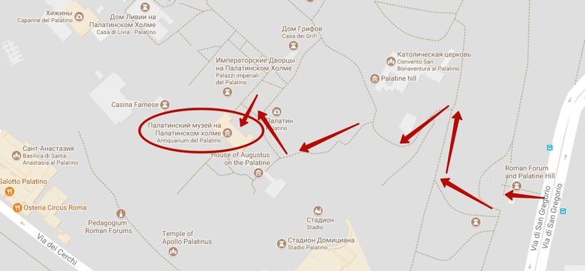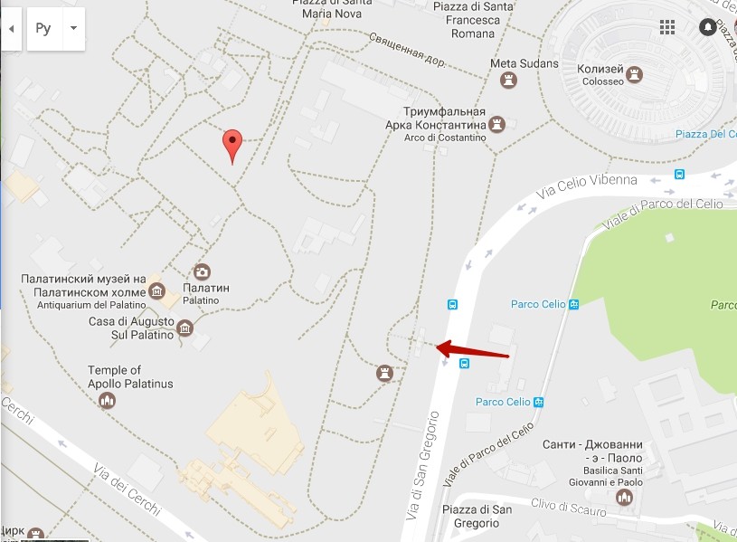Попасть на Палатин можно, поднявшись с Форума (вход там, где арка Тита - напротив Колизея), либо войдя напрямую с улицы via San Gregorio.