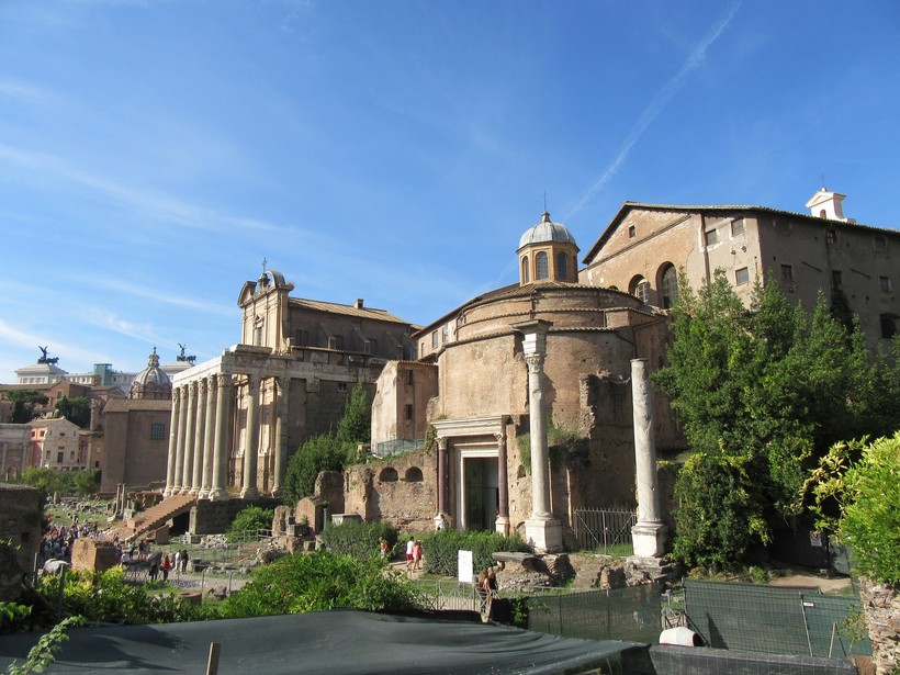 В общем, в итоге на фасаде выгравировали надпись: "Divo Antonino et Divae Faustinae ex S(enatus) C(onsulto)" (т.е. «Божественному Антонину и Божественной Фаустине по решению Сената»), которая сохранилась до наших дней. Чего не скажешь о самом храме: на самом-то деле, от исходного здания, как и в случае с храмом Сатурна, остался только парадный вход с колоннами, а остальное уже поздняя пристройка и к императорскому Риму отношения не имеет. В средние века здесь построили христианскую церковь Св. Лаврентия (Chiesa di San Lorenzo in Miranda), добавив к крыльцу-атриуму древнего храма Антония. Такой вот странный гибрид получился: романская базилика в окружении десяти мраморных античных колонн. А в центре – руины старого алтаря.