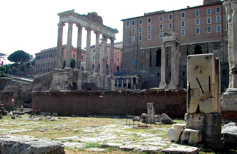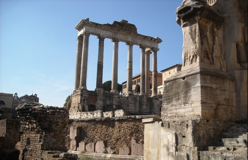 Наверно, самое древнее религиозное здание в Риме и уж точно самое старое из тех, от которых сегодня хоть что-то осталось. Восемь мощных колонн, высящихся на травертиновом фундаменте – очень заметный элемент Римского Форума и одно из самых узнаваемых изображений античных развалин. Около храма Сатурна римляне праздновали свои весёлые сатурналии, а внутри находился не только алтарь и золотая статуя одноимённого бога жатвы, но и государственная казна-эрарий, и склад законодательных дощечек-табличек... то есть в те времена, когда там было внутри чего находиться, сейчас-то один фасад остался.