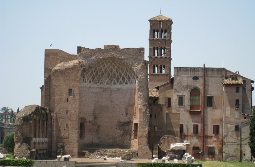- базилика Косьмы и Дамиана – построена в 6 в. при папе Феликсе IV в результате объединения древнего храма Ромула с библиотекой в целях борьбы с язычниками и конкуренции с культом других братьев Кастора и Поллукса,