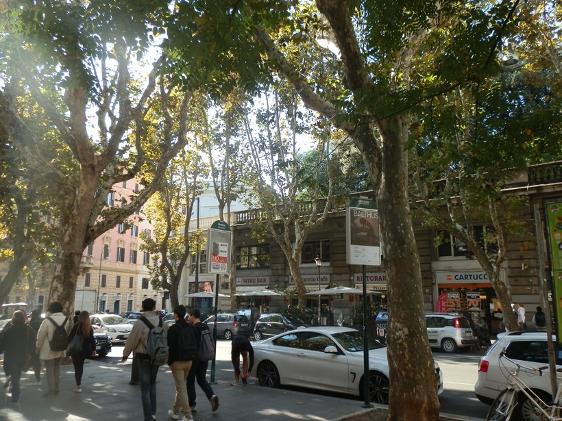 Как говорится, почувствуйте разницу с камерной обстановкой древних улочек: на via Merulana снуют машины, торопятся куда-то люди, работают магазины. Впрочем, в Риме и на таких улицах весьма уютно – в любое время года они зелены и достаточно чисты. Три вещи неизменно радуют меня в Риме: зелень повсюду (даже на крышах), парки с лавочками повсюду (и обязательно найдётся свободная) и питьевые фонтанчики с вкуснейшей водой практически везде (спасибо гениям Древнего Рима!).