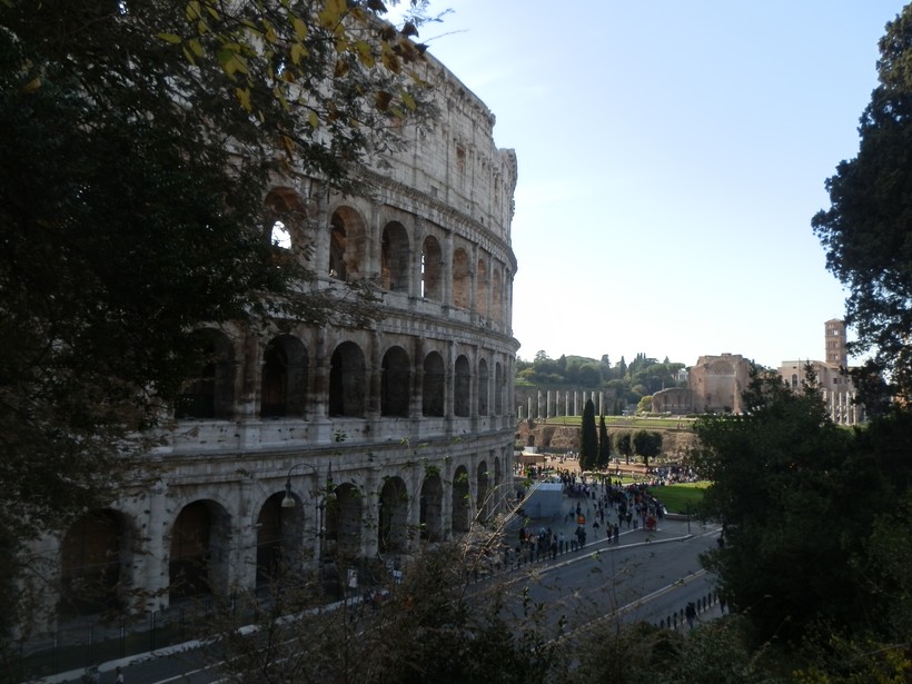 С места, где мы стоим, уже прекрасно виден Колизей (13). Он выглядит этаким островом древности в окружении современных улиц, по которым непрерывно проносятся автомобили. Это ещё один фирменный знак римских улиц: они полны временных контрастов.