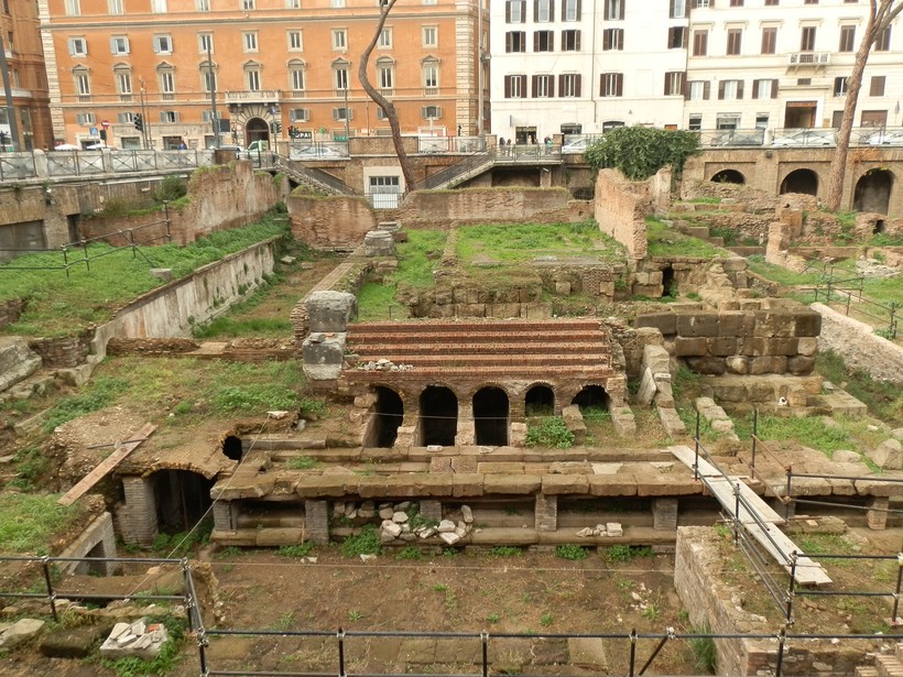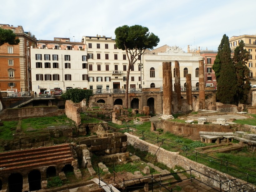 Двигаясь дальше по via Botteghe Oscure, переходим несколько улиц, пока не выйдем на просторную площадь с высокой башней. В центре площади – большая огороженная археологическая зона, так называемая «Area Sacra» (16).