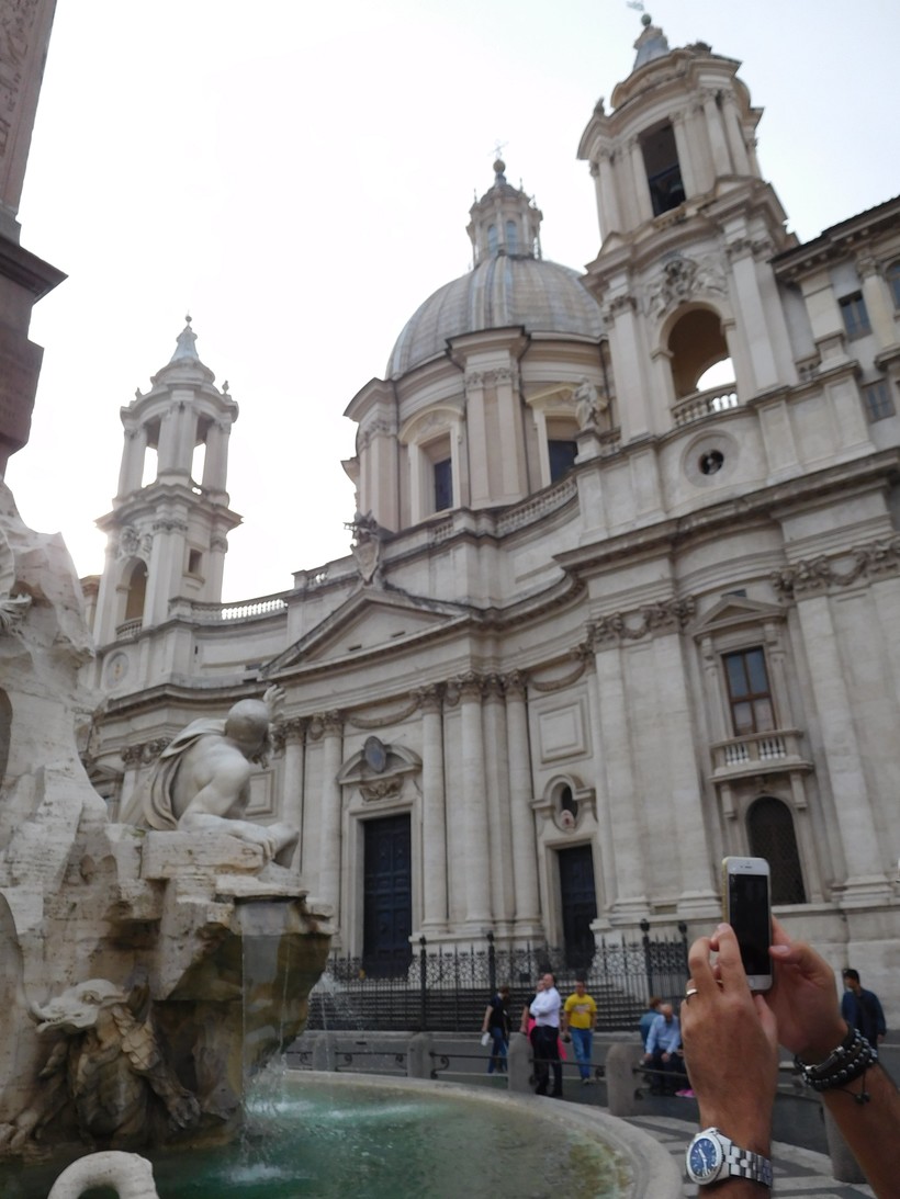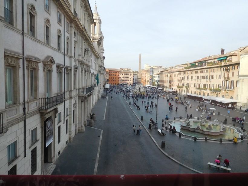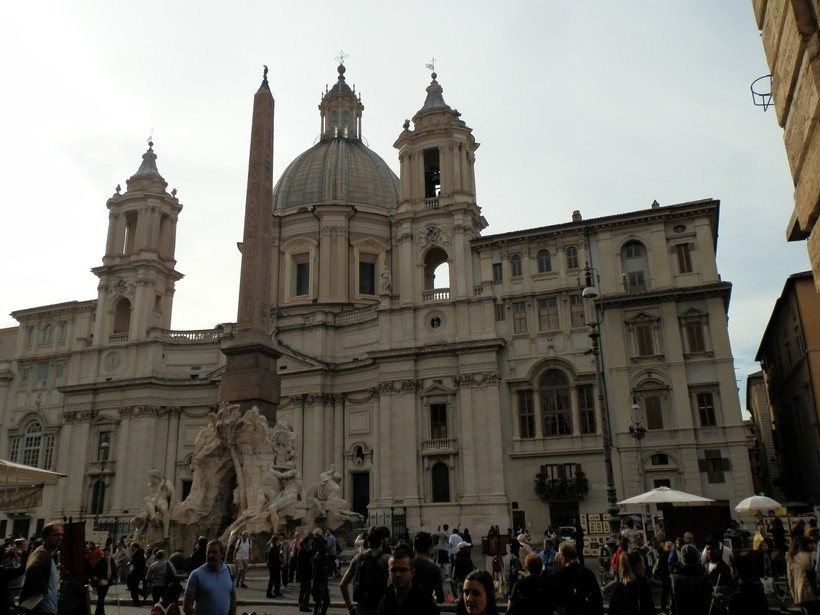 Ну а мы выходим на piazza Navona (20). Эта римская площадь своими контурами повторяет древний стадион Домициана, построенный в 85г. Здесь в основном проводились спортивные состязания (атлетика, борьба и т.п.) Арена вмещала 30 000 зрителей – всё в Риме делали с размахом. С северной стороны, за площадью открыт музей развалин стадиона, да и на самой пьяцца Навона множество достопримечательностей. Не буду описывать их подробно, остановлюсь только на забавной легенде, связанной с церковью Сан-Аньезе ин Агоне (21) и Фонтаном Четырёх Рек напротив неё.